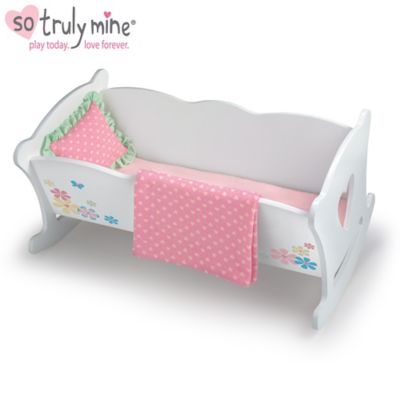 Dolls Cradle Rocking Bed Heart Design Bear Mattress Pillow Bedding