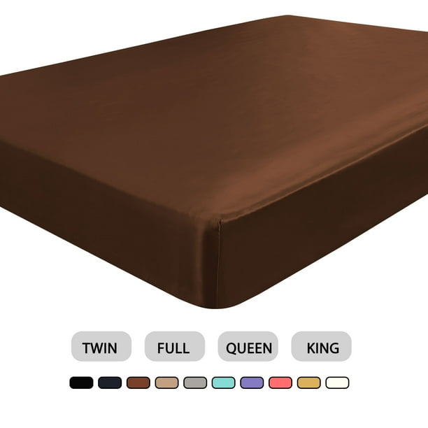 Satin Silk Fitted Sheet 12 Large Pocket Bottom Sheet Queen Brown